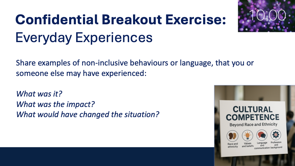 In pairs/small teams, share examples of non-inclusive behaviours or language, that you or someone else may have experienced: